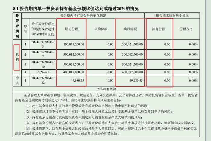 该基金2023年年报显示,截至2023年末,该基金有25亿份份额由机构投资者持有,占比99.99%。该基金2024年二季报显示,该基金存在单一投资者持有基金份额比例达到或超过20%的情况。具体看,是4名机构投资者分别持有5亿份、5亿份、4亿份、7.5亿份。二季度,持有7.5亿份的机构投资者将其份额全部赎回,在该基金二季度总赎回的8亿份额中占比超过90%。经过二季度赎回后,该基金截至二季度末的份额为17亿份。