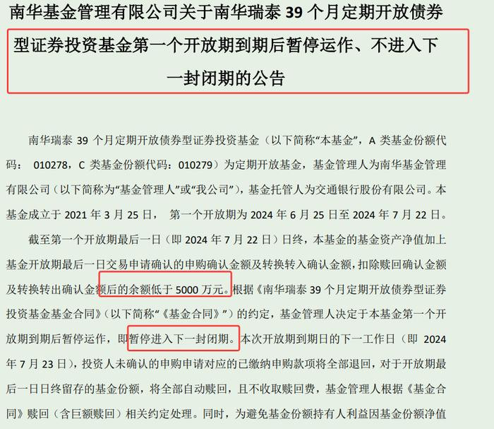 根据南华基金2024年7月23日公告,截至第一个开放期最后一日(即2024年7月22日)日终,南华瑞泰39个月定开债基的基金资产净值加上基金开放期最后一日交易申请确认的申购确认金额及转换转入确认金额,扣除赎回确认金额及转换转出确认金额后的余额,低于5000万元。根据相关约定,南华基金决定于该基金第一个开放期到期后暂停运作,即暂停进入下一封闭期,开放期最后一日日终留存的基金份额,将全部自动赎回,且不收取赎回费。