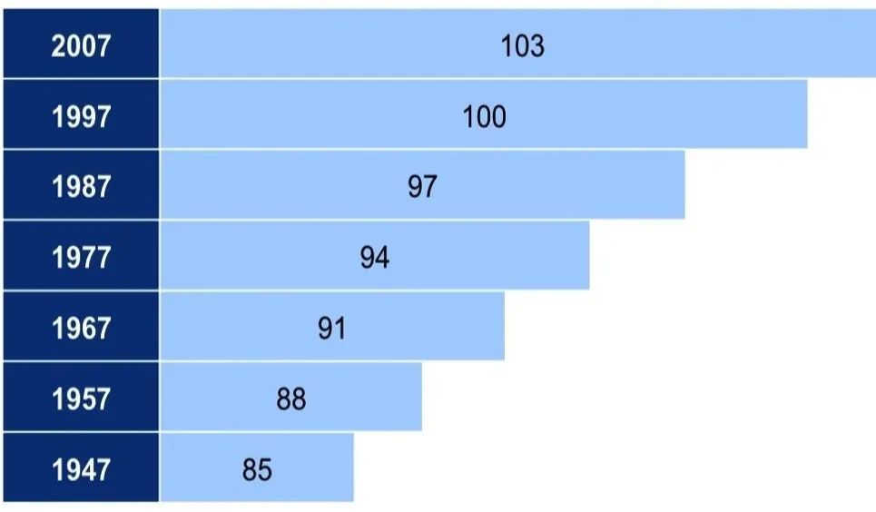 因此,人的衰老比我们的普遍认知要早,但衰老的过程非常缓慢,事实上,随着世界和平的延续、科技和医疗水平的提高,预期寿命不断的延长。如1949年,我国的平均预期寿命只有34岁,如今则达到了78岁的水平。国外有一项大数据统计表明,人类每隔10年,平均预期寿命就可以增长3岁。如1977年出生的人,预期寿命为94岁,1987年出生的人,预期寿命则可以提高到97岁了。
