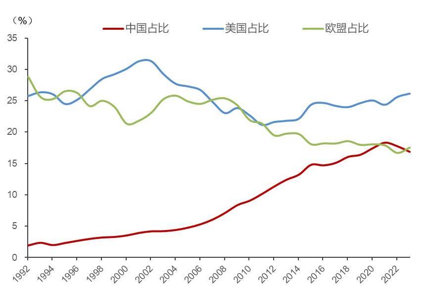 三大经济体GDP占世界比重(美元计价)(%)